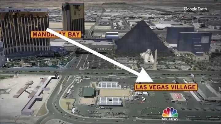 白色箭头即枪手射击方向,射击点距离人群大约200米左右(NBC News 截图)