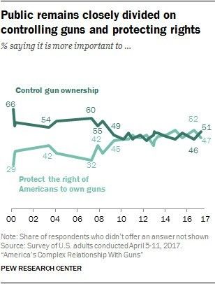 上图这项皮尤研究中心进行的调查显示,2007-08年时,曾有半数民众支持政府采取控枪措施,但之后双方人数开始反复交错。奥巴马政府上台后,控枪议题被反复提及,这让许多保守人士担心宪法第二修正案赋予自己的控枪权利岌岌可危。整体社会舆论走向保守,“茶党”等保守主义运动开始活跃,美国的控枪形势不容乐观。
