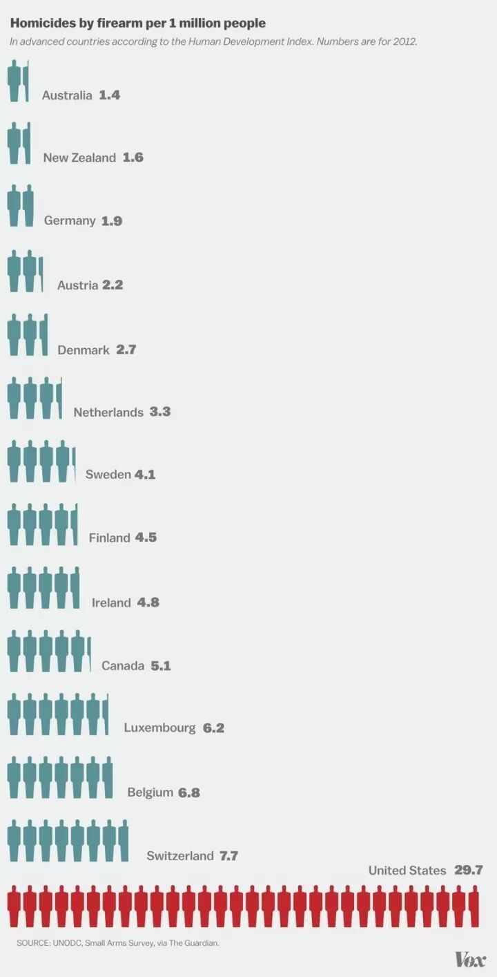 ,比起邻国加拿大,美国的枪击数量要高出6倍,比德国高出了令人震惊的16倍。