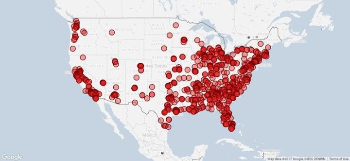 桑迪胡克小学枪击案后美国发生的枪击事件地点分布