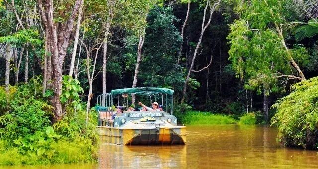 抵达后前往【热带雨林公园】--探索世界最古老的热带雨林之一,这里炎热潮湿的环境给无数植物提供了绝佳的生长环境,郁郁葱葱的雨林展现在人们眼前,令游客流连忘返。在园中搭乘【水陆两用军车ARMYDUCK】。这是二战时期遗留下来的军用车,乘着它越过藤蔓荆棘,或浮游在沼泽泥泞穿梭,犹如返回到上古时代(约40分钟)。人们在这里既可以感受冒险的乐趣,又可以实实在在领悟到浓郁的澳洲热带风情。