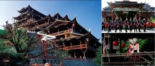 国家4A级景点土家人心中的圣地--土家风情园(费用120元/位自理),园内有醉人的土家拦门酒、可观神秘的土家祭祖活动、土家历史文物展示、土家民俗演示,特别是【冲天楼】,依山造阁,气势恢宏,楼高48米,九重十二层,曲径回复,独具匠心,曾荣获“九重天”“千人毛古斯”两项世界吉尼斯之最。