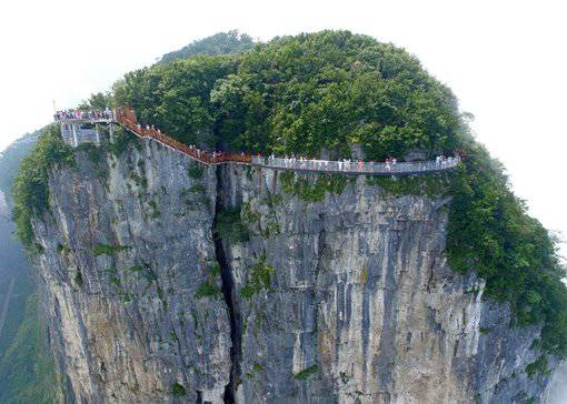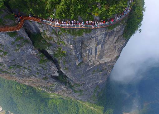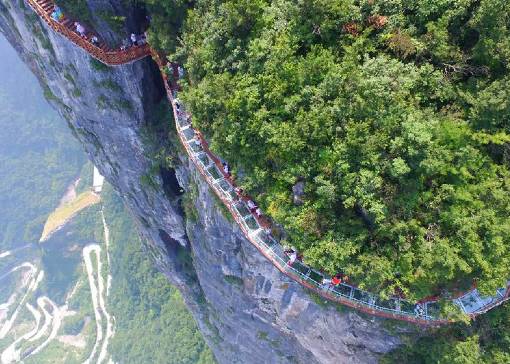 天门山玻璃栈道,悬于天门山顶西线,长60米,宽1.6米,最高处海拔1430米。是张家界天门山景区继悬于峭壁之上的鬼谷栈道、凭空伸出的玻璃眺望台、横跨峡谷的木质吊桥后打造的又一试胆力作。