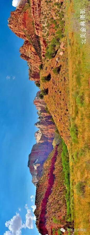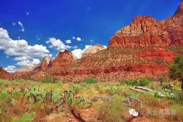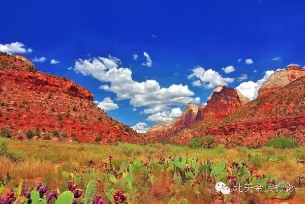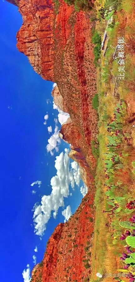 锡安国家公园(Zion NationalPark)是离布莱斯峡谷最近的一处以雄伟壮观的巨山闻名的公园,它的险陡山岭可与中国华山比肩媲美。园内陡峭的“棋盘平顶山”裸露岩石的山体表面似被刀刻凿过而留下如棋盘方格的细沟,而被称为“西神庙和处女峰”的红岩石山与锡安山构成了锡安国家公园最壮观的山体,用《》中的圣山--锡安山命名的锡安国家公园。当汽车穿过据说是北美国家公园最长的于一九三零人工凿通建成的隧道后进入锡安国家公园内,只见群山如“华山”般陡峭险峻,道路是红色,所有山石都是红色的,唯有天空是湛蓝。山谷中的沙漠仙人掌的花在盛开之中,锡安峡谷中绿树遮蔽下的维京河(Virgin River)潺潺流水呈现着美丽翡翠绿色,天际忽然飘来几朵硕大无比的白云,一时间将锡安国家公园鲜红的巨山变成一幅蓝天白云鲜花盛开艳美自然风光画。