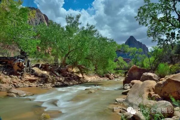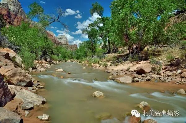21锡安峡谷中绿树遮蔽下的维京河(Virgin River)潺潺流水呈现着美丽翡翠绿色一