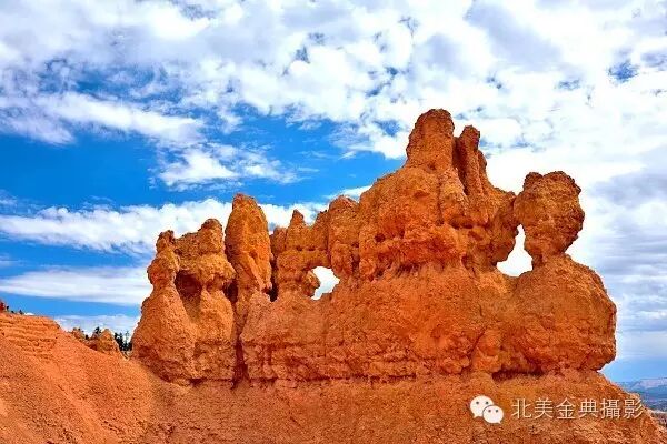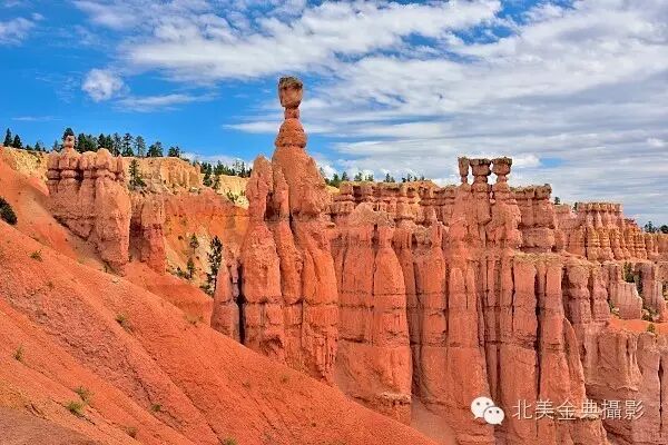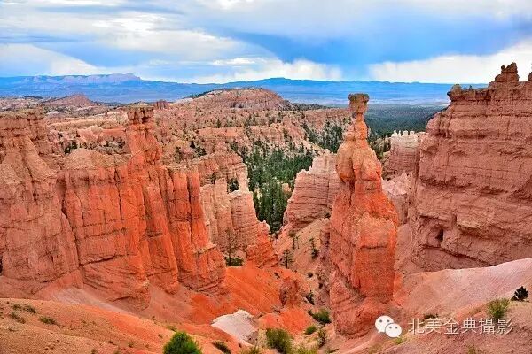 电影《阿诗玛》外景拍摄于驰名的云南石林,而在地球另一端美国还有“云南石林”的姐妹“犹他石林”,又名“无顶洞穴”,它就是犹他州的布莱斯峡谷国家公园(Bryce CanyonNational Park)。虽是美国最小的国家公园,但园内成千上万红如柑橘高低错落红岩砂石柱排列整齐地遍布整个峡谷中,形状奇异的红砂岩石柱看似排列整齐的成千上万待检阅士兵,大自然神工鬼斧用红砂岩石造出的红石林,红石墙和红山气势磅礴宏伟壮观。从位于悬崖顶上的日出,日落或布莱斯观景点放眼远望布莱斯峡谷,其形状像古罗马的“斗兽场”,众多石林石墙的景点,如宝瓶星座高原(Aquarius Plateau),布莱斯露天剧场(Bryce Amphitheater),亨利山脉(HenryMountains),红岩断崖(Red Rock Cliff),白岩断崖(WhiteRock Cliff)尽收眼底,红砂岩石的粗糙表面在阳光照耀下发出酷似刚从火山口喷涌的岩浆柑橘红色。而在北边悬崖俯瞰处,“喉头石锤”(Thor`s Hammer)与众不同的形状而在数万根红砂岩柱中如鹤立鸡群般吸人眼球。峡谷底部自然生长的北美杉树镶嵌在石林中将布莱斯峡谷装饰成一座巨大的迷宫。