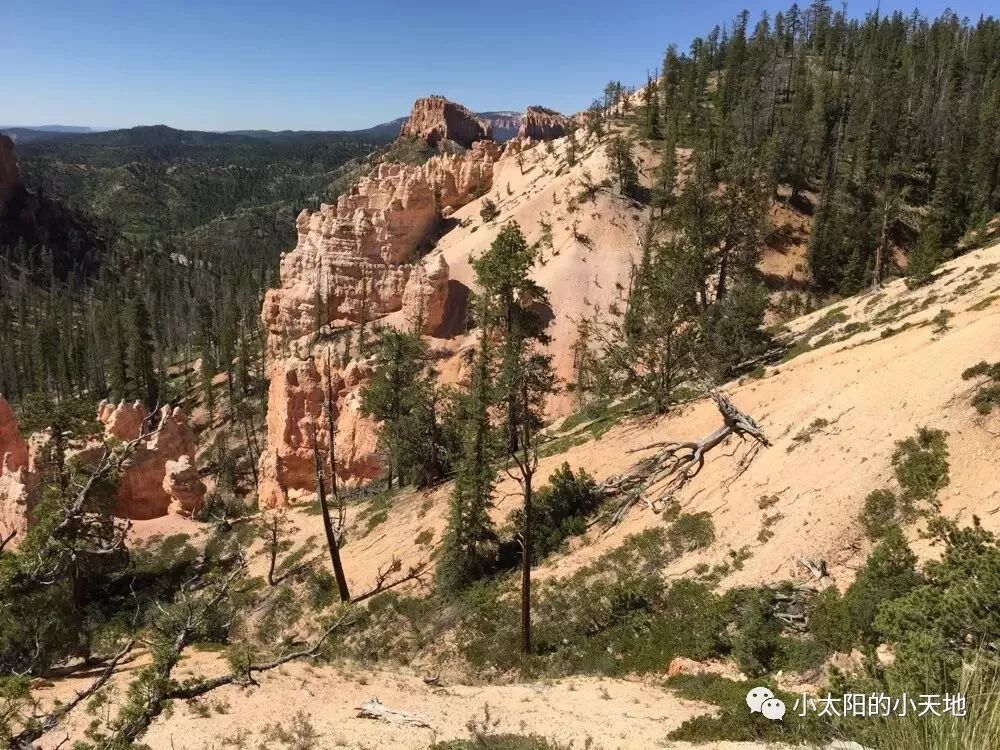 随着车辆上山的脚步,我们观察到坐立在道路两旁的石头颜色发生了变化,从红色的泥制砂岩,钙质砂岩慢慢到绿色的石头。在山顶上还有大大小小的观景台,我们观察到在美国,每一个国家森林公园,环境保护的都特别好,没有半点垃圾的身影。而且,美国人都特别善良,看到你他们会有好的跟你打招呼,而且他们都会把随身的垃圾带走。