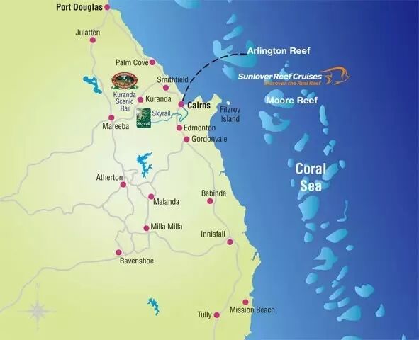 游客们可以前往位于凯恩斯市中心的凯恩斯船码头1 Spence Street一楼预订和办理登船手续,领取登船牌,乘坐太阳恋人号游轮,约1小时15分即可到达爱灵礁。