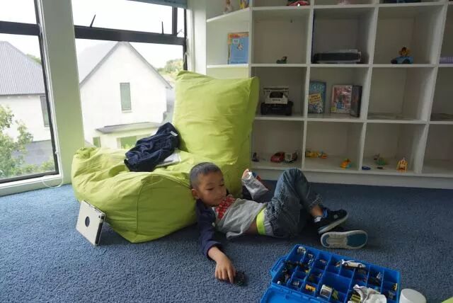 楼上小客厅里有许多玩具,小盆友爱不释手,玩累了吃点薯片,慵懒地靠着沙发躺下,早起飞行的疲劳,在这个小天地里立刻得到了释放。