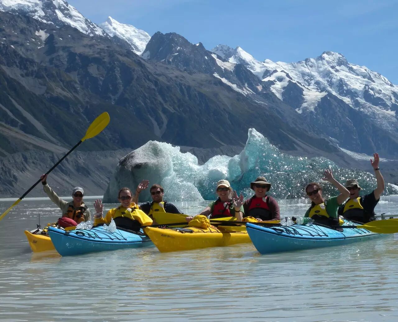到达Cook山后,可以参加2点半开始的冰川湖皮划艇活动。这是体验冰川美景的一项极致体验活动。将在Mueller冰川湖进行3个小时的行程。Mueller湖位于新西兰最高峰中,不但可以看到冰川的景致,还可以在深蓝色的冰湖中畅游。每天的行程只能容纳8位乘客;适合没有任何皮划艇经验的初学者。