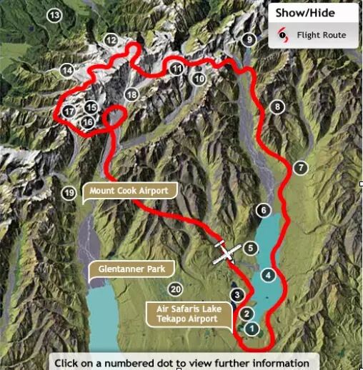 最受欢迎的观光飞行是“大穿越之旅”(Grand Traverse)。该飞行用时50分钟,首先飞经蒂卡普湖绿松石般的蓝色湖水以及该湖周围的美利奴羊山区农场。飞机继续飞行至戈德利山谷(Godley Valley),飞过戈德利、默奇森冰川(Murchison Glacier)和塔斯曼冰川(Tasman Glacier),然后穿越至西海岸并飞过雨林,以及著名的弗朗兹约瑟夫冰川(Franz Josef Glacier)和福克斯冰川(Fox Glacier)。接着,飞机飞越塔斯曼山(Mt Tasman),新西兰的第二高山。之后,飞机绕库克山飞行一周,库克山是新西兰的第一高山,主峰海拔3754米,乘客们可饱览这座雄伟山峰的壮美景观。最后,飞机飞过库克山村庄和麦肯奇盆地(Mackenzie Basin),返回蒂卡普湖。