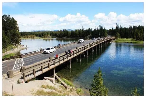钓鱼桥横跨黄石河,而在桥上我们可以看到野生的鳟鱼在湖中跳跃,非常的生猛,据说地热曾经把鳟鱼都活生生煮熟了。尽管钓鱼桥上不能钓鱼,但是确实一个观鱼的绝佳好地方。