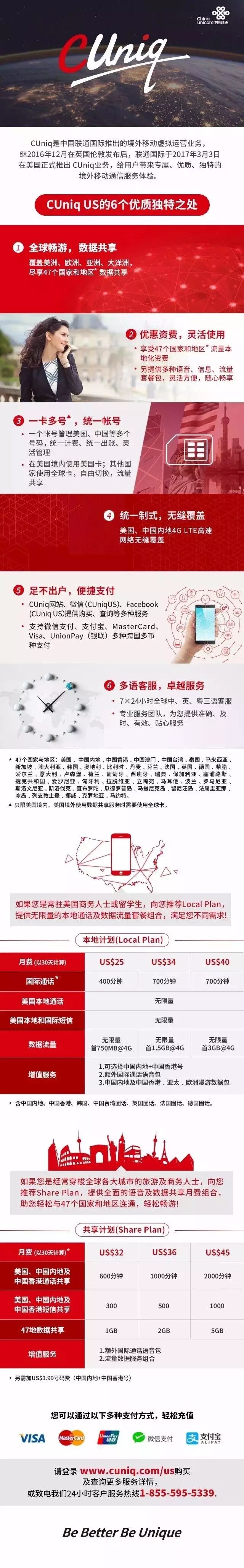 联通国际在美洲发布的CUniq “一卡多号”业务,提供共享计划(Share Plan)、本地计划(Local Plan)以及访客计划(Visitor Plan)三种套餐服务,分别适用于全球商旅人士、美国本地用户及短期访客。