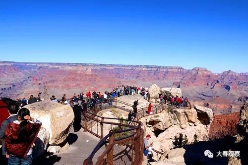 大峽谷国家公园的停车场,离主观景台Mather Point只有几分钟的距离,美国导游要求我们做一个游戏:两人一排,用外套遮住头,一个扶着一个向前走,到观景点会告诉大家。果然,几分钟后,导游说可以揭开外套了,毫无征兆,大家睁眼一看,“哇!”的一声都惊呆了,面对突然出现在眼前的大峽谷,我的感觉只有两个字:震撼。