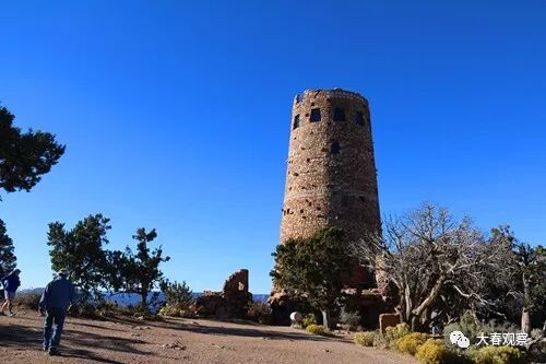 我们在南峽的第二个观景点是DESERT VIEW,这里的主要标志就是一座印第安人的了望塔,远远看去,就像战争年代的碉堡。导游说这叫沙漠之塔,因在塔上能看到北面的沙漠而得名。登上塔来,里面陈列有许多印第安人的用品和图案,在塔的顶端向外看去,视线果然辽阔了许多。
