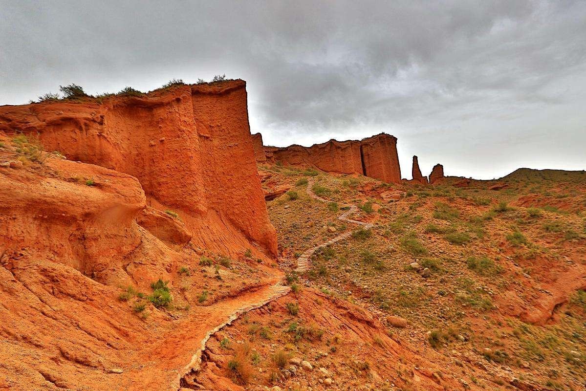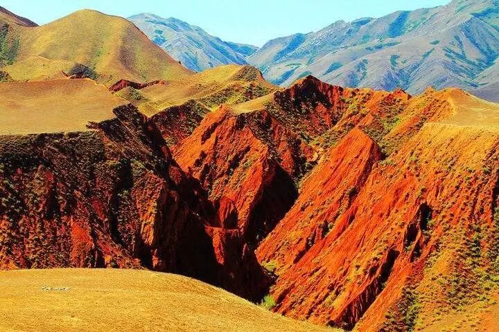 神秘的天山大峡谷由红褐色岩石经过大自然亿万年的风刻雨蚀形成,红褐色的山体群直插云天,在阳光照射下,犹如一簇簇燃烧的火焰。