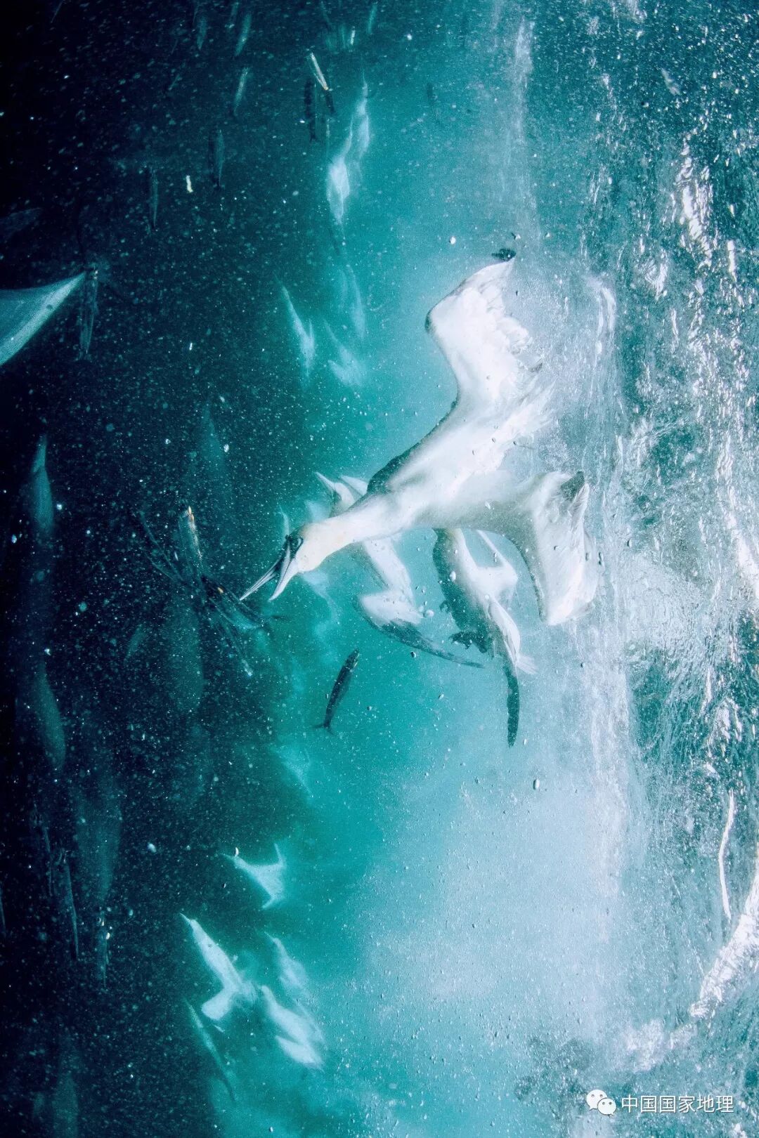 在沙丁鱼盛宴中,鲣鸟紧紧跟随海豚,海豚将沙丁鱼驱赶至水面,这恰好在鲣鸟的潜水深度之内。鲣鸟是天生的游泳和潜水高手,捕鱼的本领非常高。