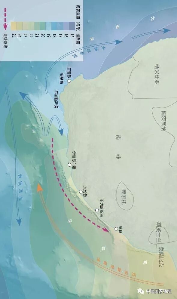 南非海岸线长约2500公里,东西南三面由大西洋和印度洋所环抱,在西岸的大西洋有由南向北的本格拉寒流流过,在东岸的印度洋有由北向南的厄加勒斯暖流流过,在南岸有由西向东的西风漂流流过
