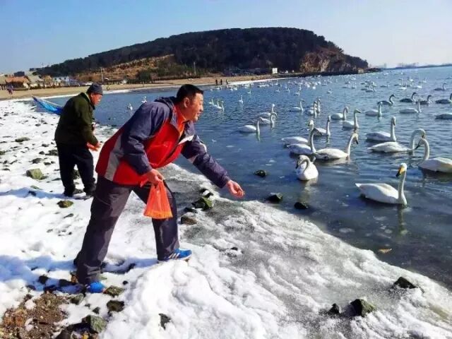 2、可以用玉米粒逗引这些天鹅,这里有一个技巧:选择海边的东端、中端或者西端(我倾向中端,两边的天鹅都可以向中间聚拢过来),足够多的玉米用红塑料桶盛着,这些天鹅认识这个红桶。找一些朋友,配合好,有喂的,有拍照的,还得有几个吆喝的。找个力气大点的,将玉米粒在空中划出一道弧线,边投撒,边用力吆喝:噢······喔~~好几个人一起喊,好了,只见远处游弋的天鹅会瞬时起飞,飞向这边来。天鹅的起飞降落通常集中在早晚两个时间段,而且距离比较远。采用此法,可以拍出清晰、优美的起飞降落镜头。 这是秘籍哈,一般不外传。