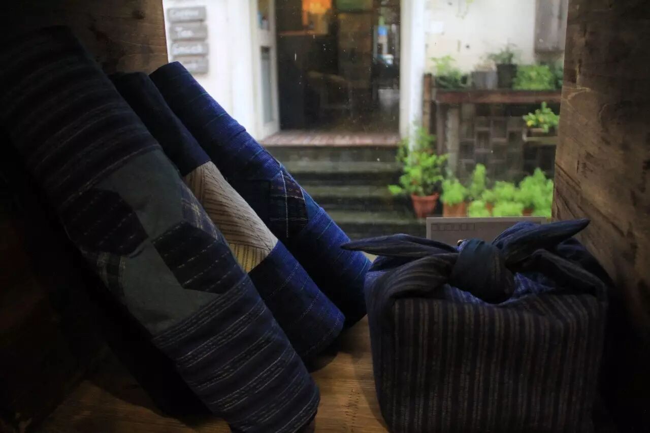荞米习茶多年,店里也有她精选的茶和茶器,偶然接触到江南土布,一下就爱上了这种蓝和白的简单色彩,于是就发挥了金牛座的执拗劲儿,硬是从穿针引线都笨手笨脚开始自学,据说连第一台缝纫机都是朋友送的旧物。
