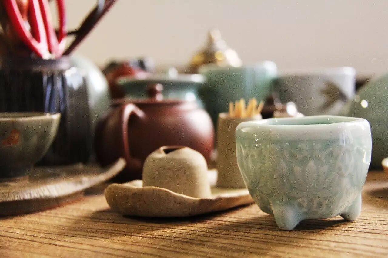 从北大街过放生桥到东井街,向左走人人人人,向右走清清静静。士土青瓷记,就在这一片清净当中。那些美好而易碎的茶盏杯碟,正好能安安稳稳地在架子上表现出一种纯净高傲的态度。