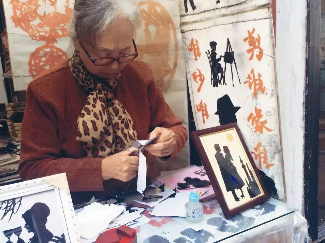 这条有魔力的街上,有一个神奇的老奶奶,看一眼铺子的招牌,一下以为穿越到了上个世纪。说是店铺,其实只有一扇门,打开门就是一张桌子,奶奶站在桌子后面,乐呵呵地让对面的姑娘给她一个侧脸,然后用手里的剪刀,两分钟,姑娘的侧影就出现在了剪纸上,我也凑热闹去剪了一张,细心的奶奶竟然连睫毛都剪得出来。