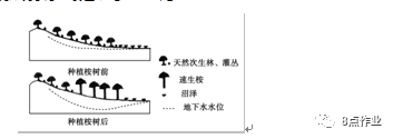 我国广西省引进原产于澳大利亚东北部热带雨林中的几种高大桉树作为造纸原料。桉树主根深扎地下,能大量吸收地下水,因为其生长迅速,3~5年即可成材,统称“速生桉”。下图示意广西种植桉树前后的变化。读图回答1~4题。