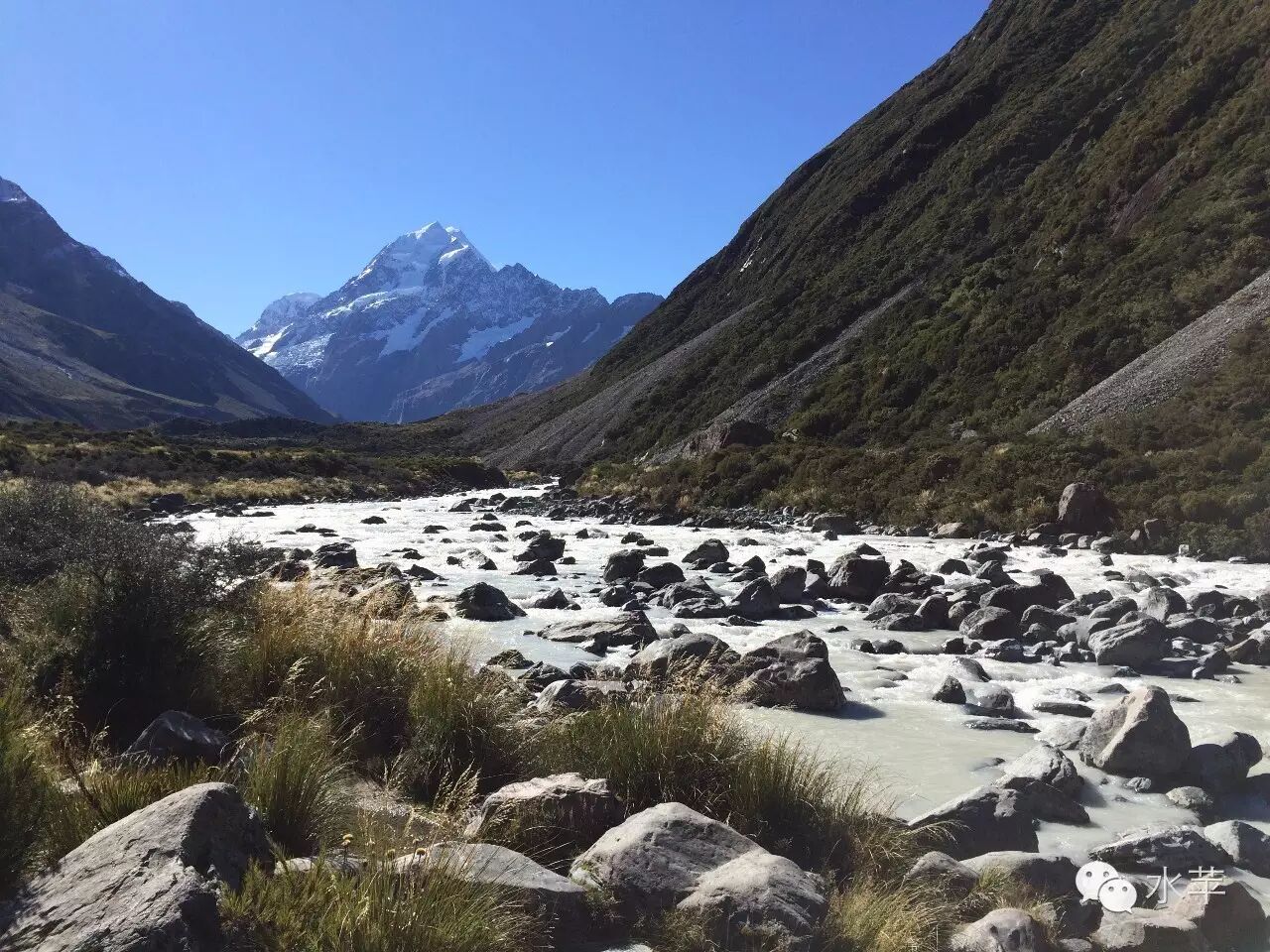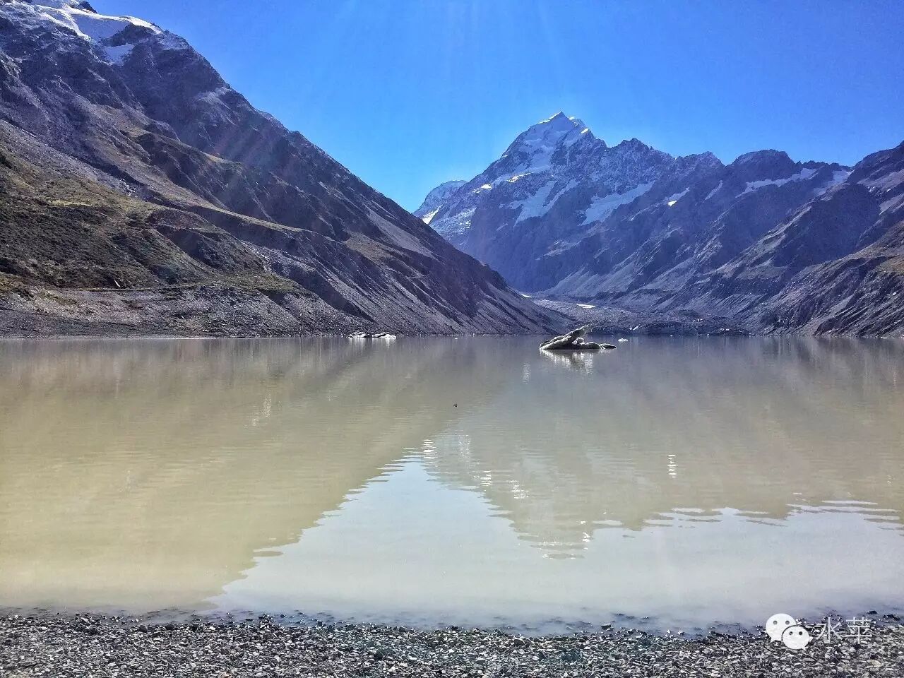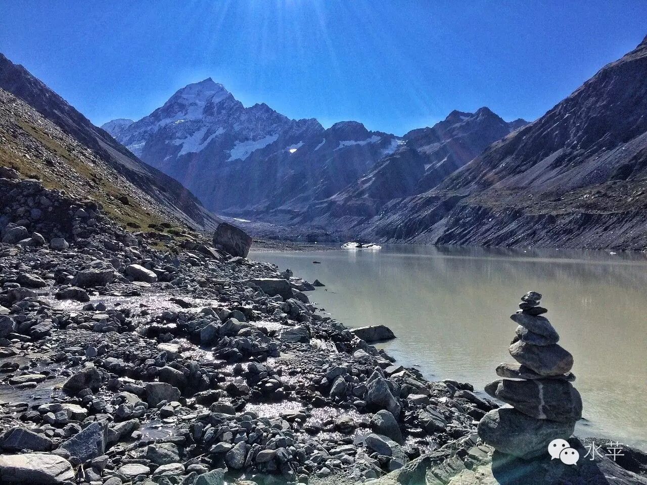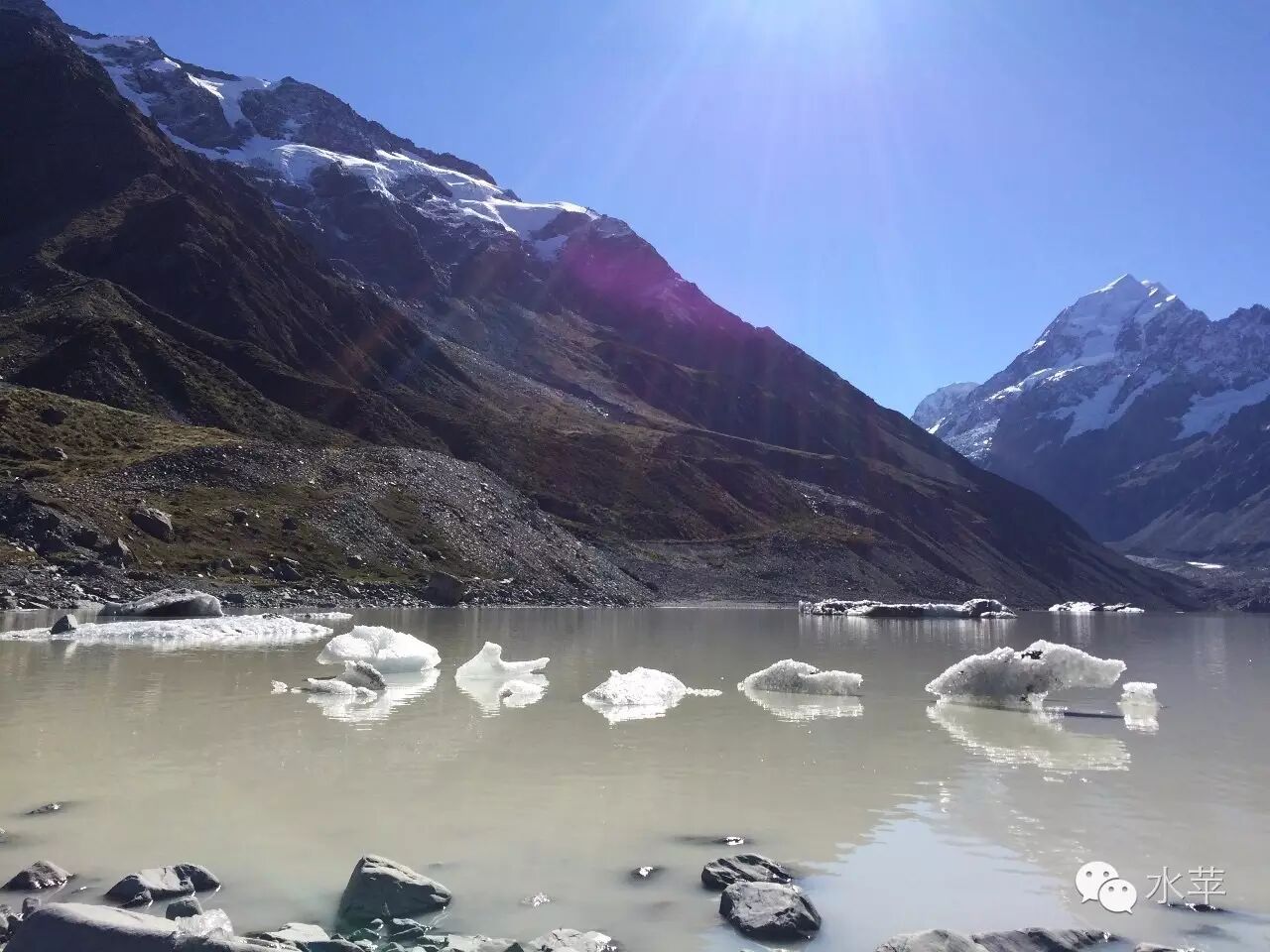 一路上经过一个纪念碑,三座吊桥,沿途夹杂着山石矿物质以及冰川融水,群峰雪山尽在眼前。终点是Hooker Glacier,冰河上还漂浮着没有融化的冰块,一路的景色壮丽迷人。