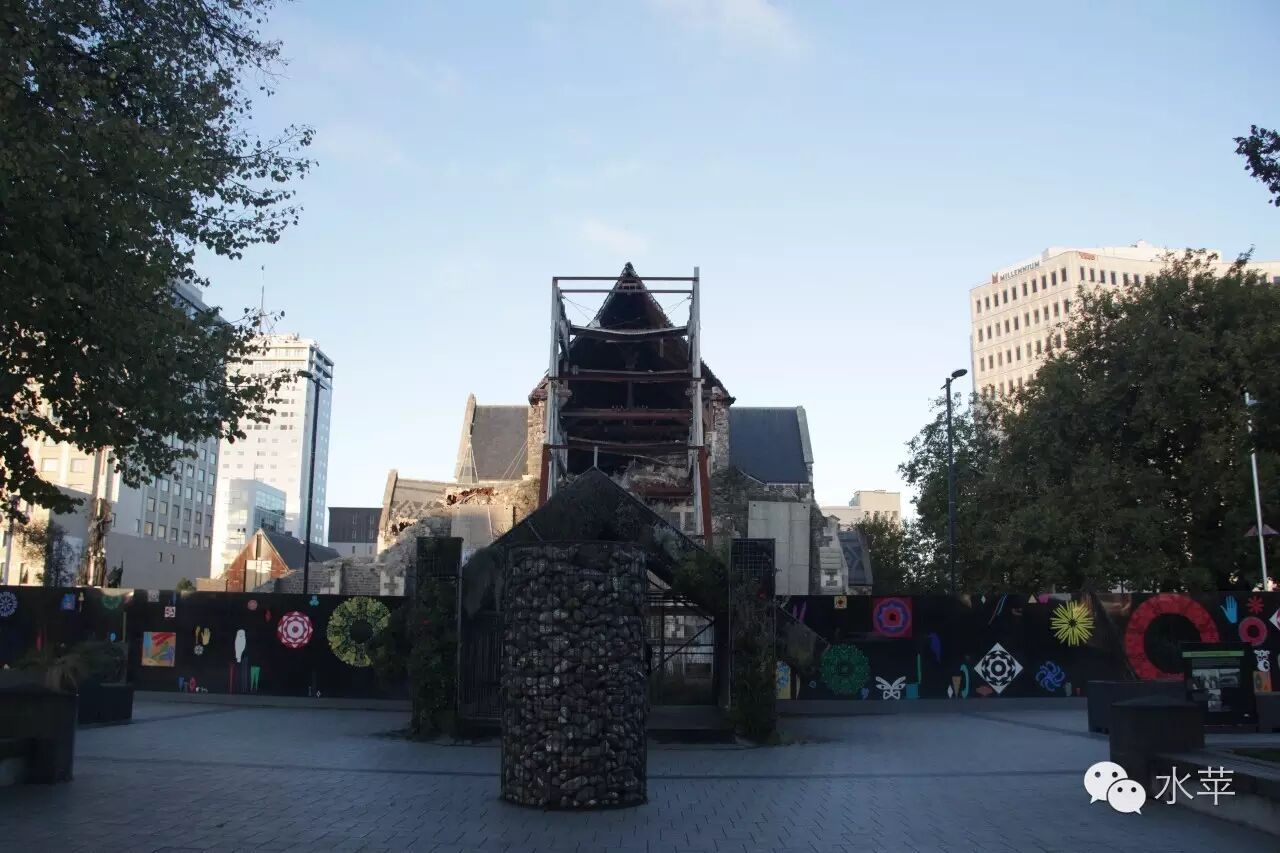 从公园里出来后步行大概十五分钟,可以走到基督城大教堂广场。2011年的大地震摧毁了当地许多的建筑,废墟随处可见。部分地方的重建工作至今仍在进行,但天主教堂因修复难度较大,政府已放弃重建,只用铁栏将残迹围起。残垣断壁,废墟前的悼念鲜花与石头,似乎都在警醒着后人,珍惜生命,珍惜眼前的一切。