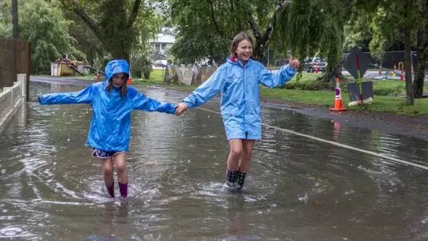 基督城两个小女孩在被撤离的前一刻,在家门口开心的享受一下洪水。。。