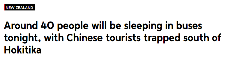南岛各地区也是瑟瑟发抖,基督城、尼尔森等城市都相继发布紧急状态。昨晚40名中国游客被困西海岸,在车上度过。