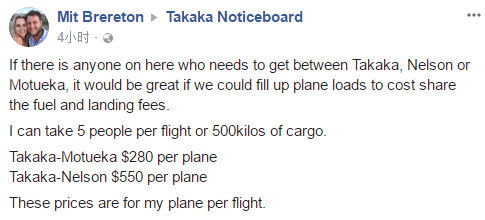 甚至还有人在Facebook上发帖拼飞机飞出Takaka,只需share飞机油费和降落费用。Takaka到Motueka一架飞机280纽币,5个人平摊每个人才56纽币,感觉比打车还要便宜呢。