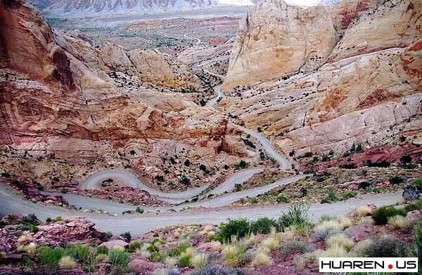最后这第三条路线自然也就是小猴要推荐的。从著名景观公路犹他12号公路(UT-12)上的小镇Boulder向东沿Burr Trail Road开36英里(约56公里)——这一段大部分是铺设好的公路,开着没那么折腾——你会经过一段之字形盘山路(Burr Trail Switchbacks),这里本身也算是一处景点吧。