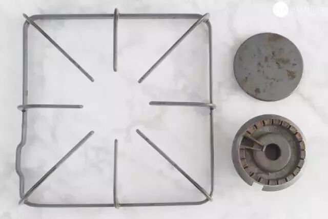 燃气灶的铁架,上面不仅有长期积累的重油污,还锈迹斑斑,很难用普通的清洁剂洗掉。
