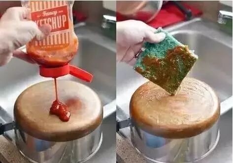 铜制锅具生锈了,番茄酱又能派上用场了,将番茄酱涂抹在锈渍表面,就能清洗被氧化的锈渍,这一清洁妙招适用于所有铜制的器具哦。