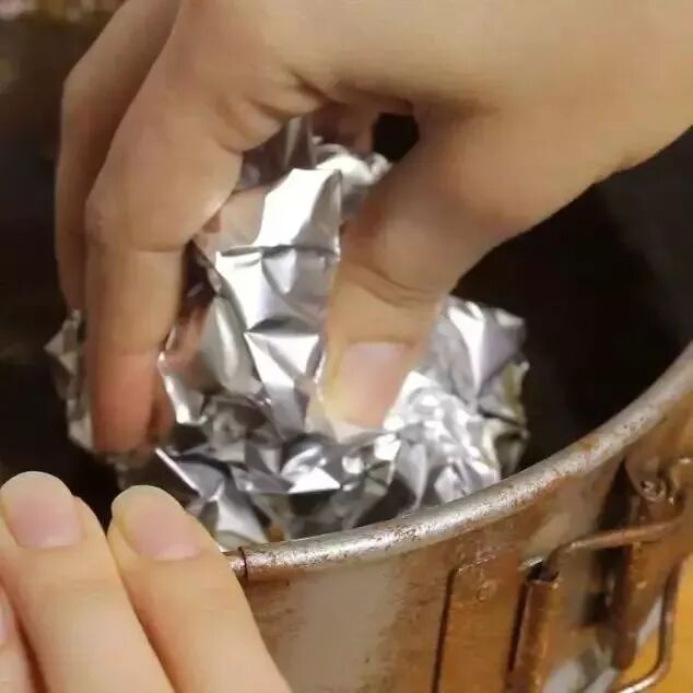 静置一段时间后,用锡箔纸擦除锅内锈迹,最后用水冲洗干净即可。