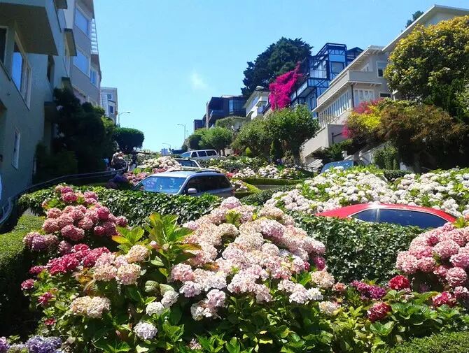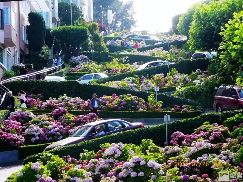斜街是旧金山的一大特色。从浪巴街到利文街这一段是一个大下坡,车道两边的花坛里种满了玫瑰,街两边家家户户也都在门口养花种草,花开时节,远远望去,犹如一幅斜挂着的绒绣,美不胜收,“花街”的美名,因此而来。