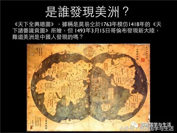 英国海军退休军官孟席斯出版了一本书叫《1421—中国发现了世界》,认为郑和早于哥伦布和麦哲伦发现了美洲并完成了环球航行。而一张在上海古玩市场淘来的古地图似乎验证了他的说法,这张地图的名字叫做《天下全舆总图》,不仅绘制了亚洲、欧洲、非洲、澳洲,甚至还有南极洲和美洲。