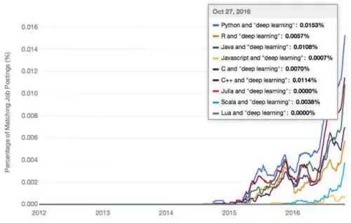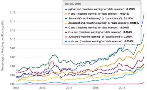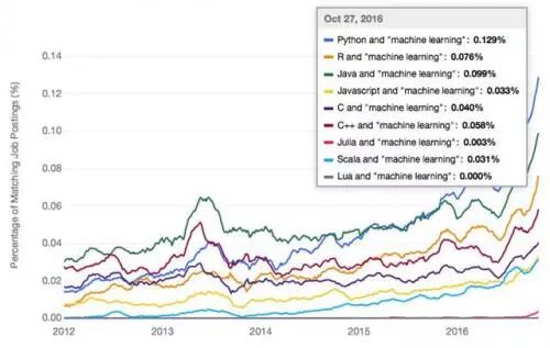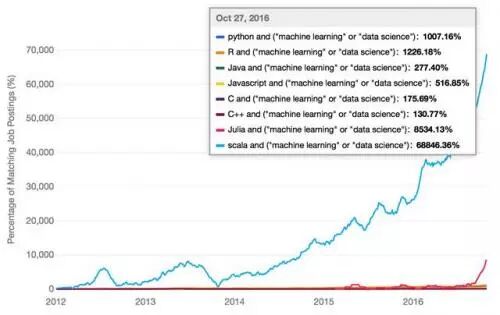 其次,所有这些编程语言都在急剧增长,反映出在过去几年里,企业对机器学习和数据科学的关注和需求正在急速增加。