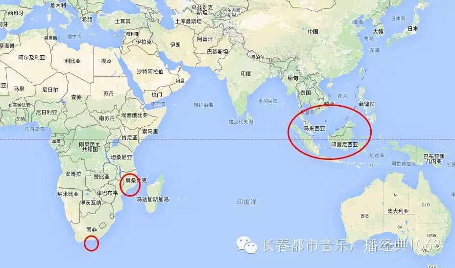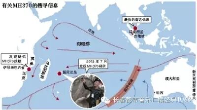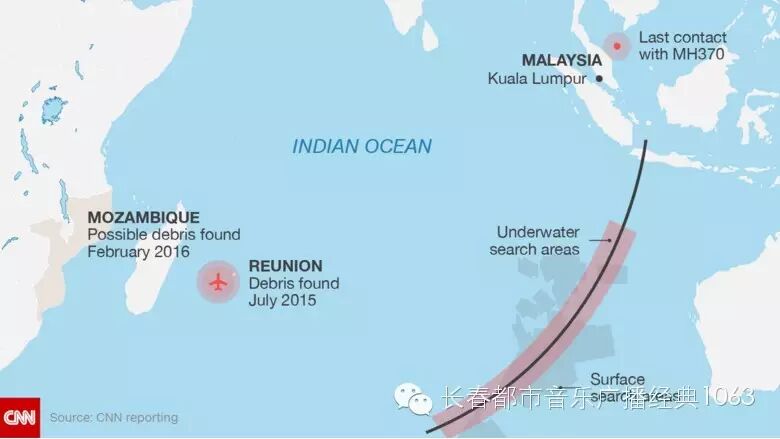 飞机失联地点、首次发现残骸地点、莫桑比克发现残骸地点示意图。