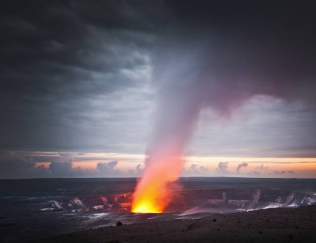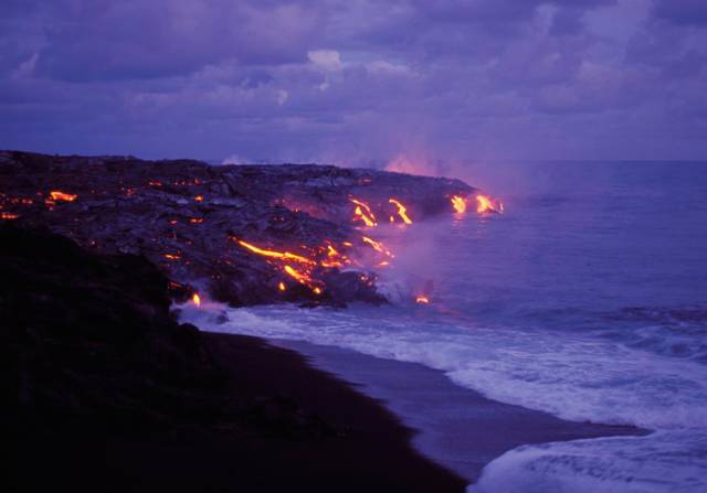 在火山活动最为活跃和集中的Puu Oo的火山口,炽热岩浆以势不可挡的气势在地下通道里奔涌向前,然后急剧地流入了海洋。这样惊心动魄的场景每天都在发生。