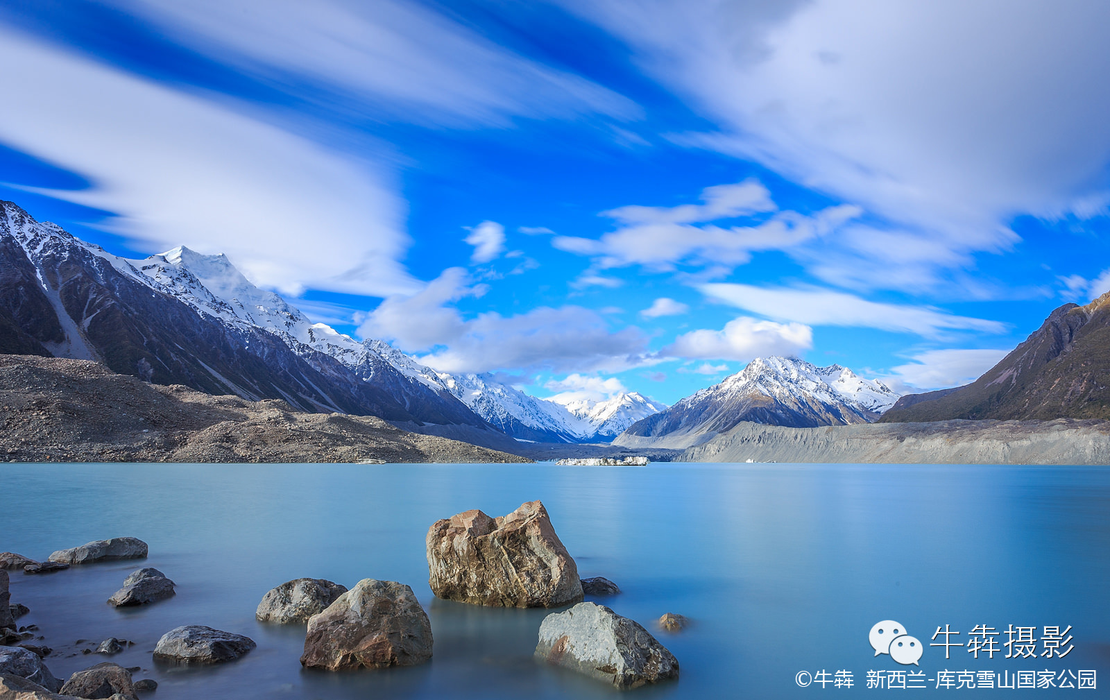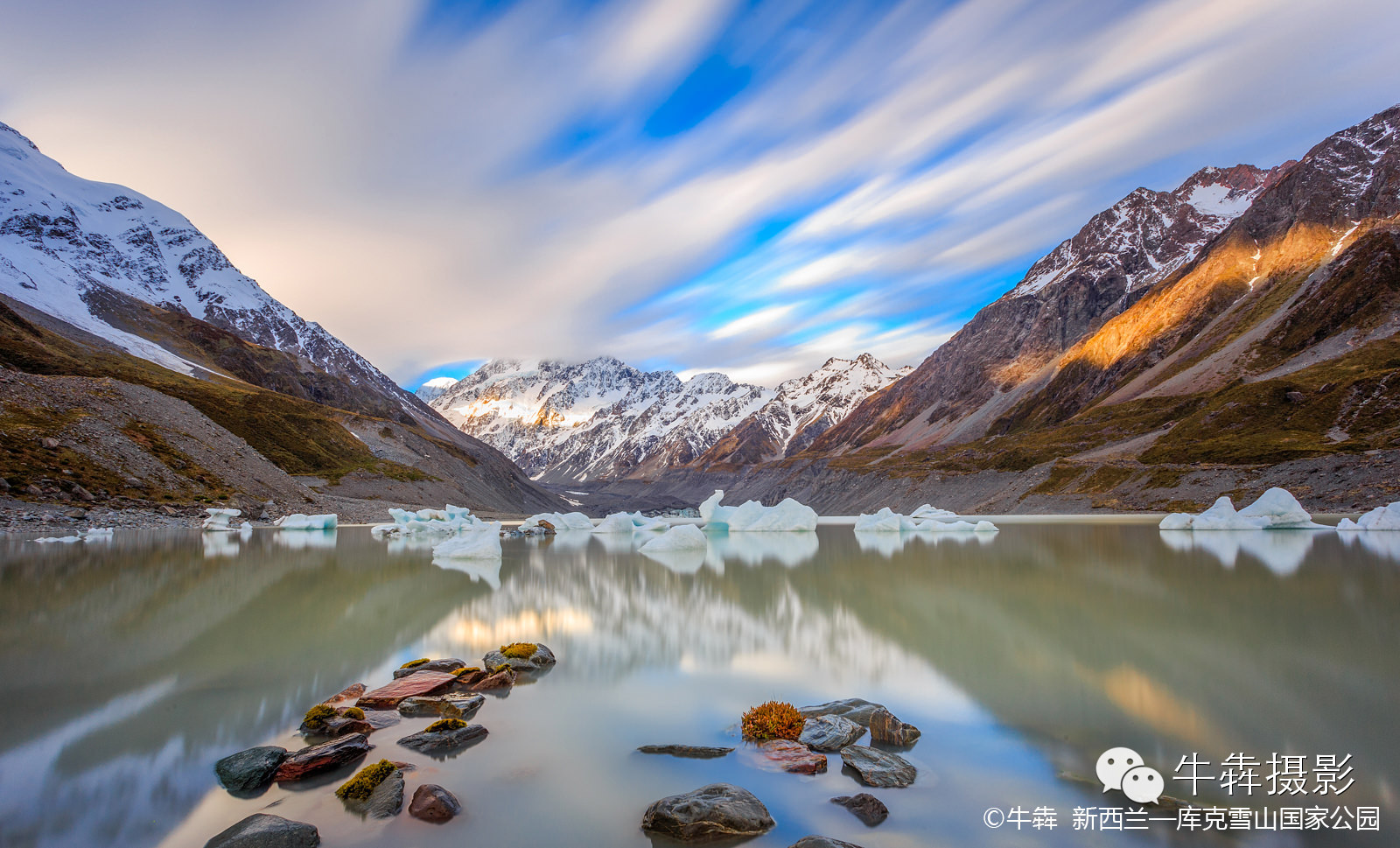 12月1日,经过一夜大雪和无电的房车营地,清晨徒步5公里进入霍克冰川湖Hooker Valley,拍摄冰川和日落,期间回营地补充食物饮水,实际全天步行超过20公里。天黑后下山到达普卡基湖边的房车营地过夜。