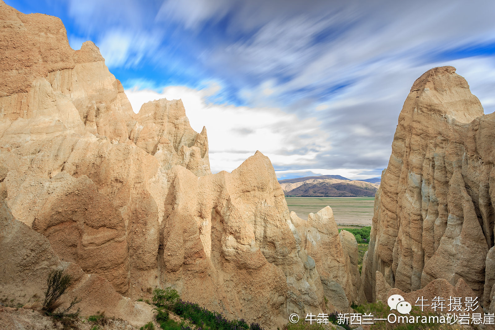 12月9日,在网上搜到奥玛拉玛Omarama有一个砂岩悬崖Clay Cliff,相关的照片很少,于是临时决定过去探路。在公路上远远可以看到半山腰的这一片悬崖,但是要绕过一大片开满鲁冰花的小河才能达到山下,由于是私人领地,进入需要事先在镇中心支付每人几刀的费用才可以,但并无人看管,完全靠个人自觉。至于攀岩拍摄的过程,留待日后专贴讲述。