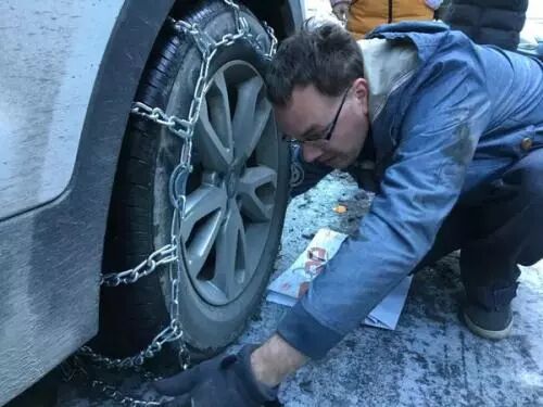 汽车需要挂防滑链,不要在同一冰下待太久,以防被砸伤。