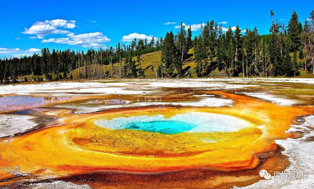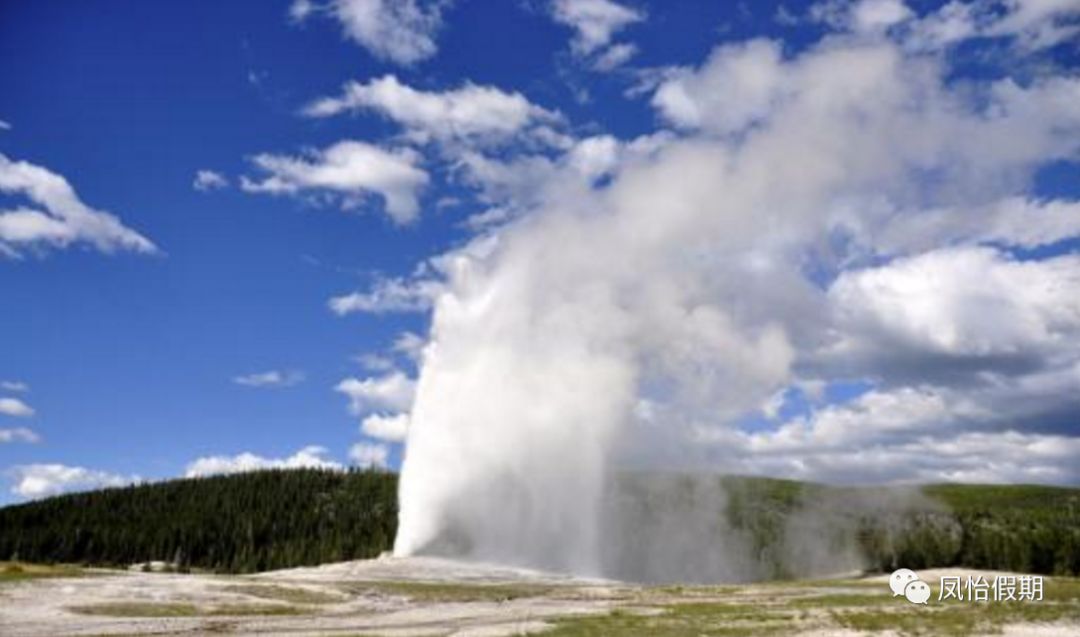 【老忠实喷泉】喷发之时犹如万马奔腾,更兼在阳光辉映下,水蒸气披上了七彩颜色。黄石公园内像这样的间歇泉喷发口,大大小小有300多个,热气、烟雾、温泉,让黄石有仙境传说的美名。