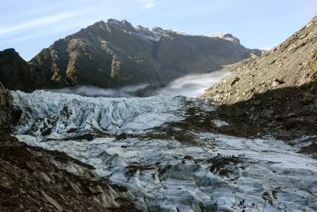西海岸的冰川——福克斯冰川和弗朗兹约瑟夫冰川,是世界上最易接近的冰川之一。亲眼目睹那些延伸至雪线下方的巨大冰川河谷,几乎入海。冰川下方的山谷斜坡引起了冰川表面的裂缝、隆起和深谷,形成了这壮观巍峨、令人胆寒的冰冻景观。在这里,时间仍“静止”在冰河时代。