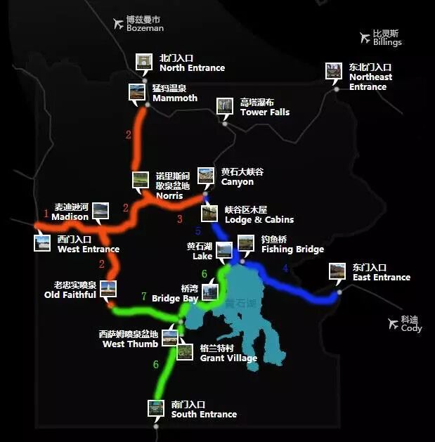 黄石国家公园共有五个入口:分别是东门、南门、西门、北门、东北门,其中西门和南门是旅行团经常出入的,西门在每年的4月底-11月初对普通车辆开放,南门则稍迟一点,在5月初到11月初对普通车辆开放。
