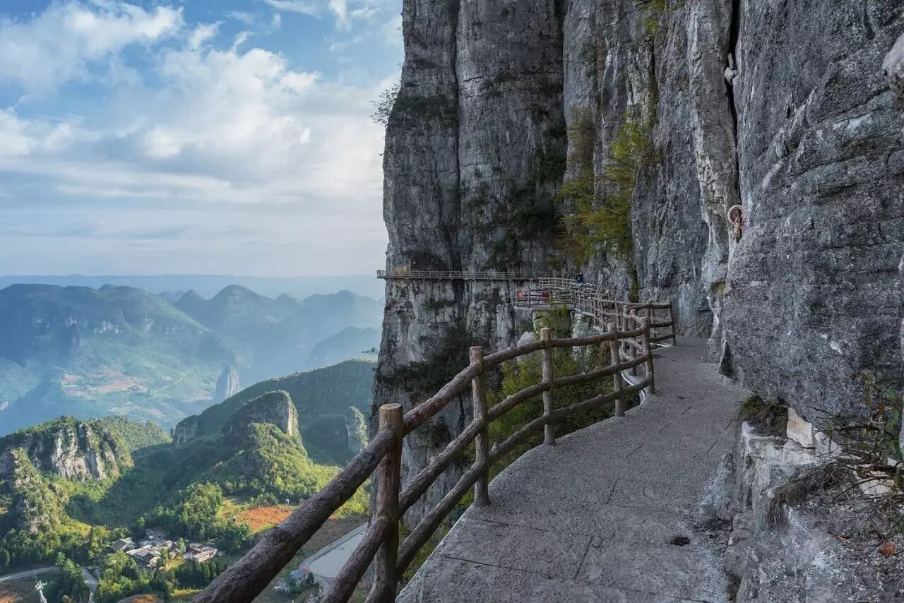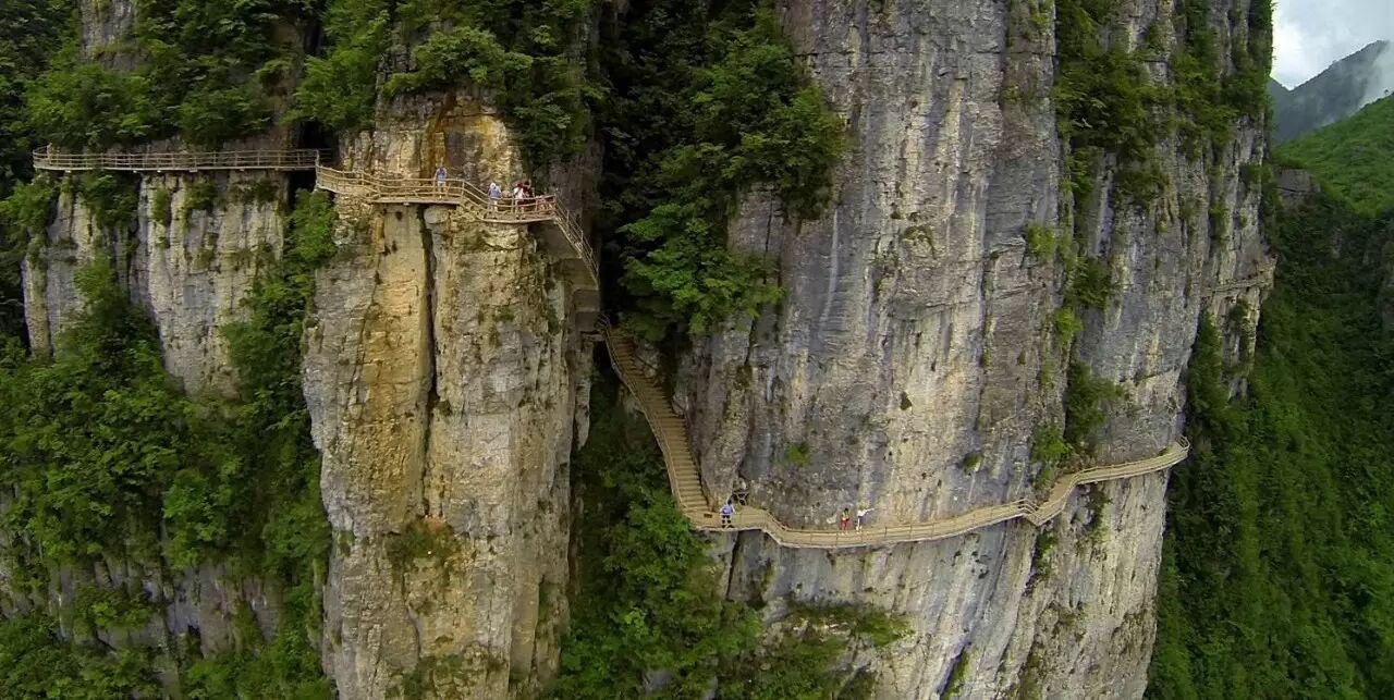 这个景点则是大峡谷中最为刺激惊险的景点“绝壁长廊”,又叫“绝壁栈道”,始建于2007年10月,全长488米,118个台阶,位于海拔1700余米、净高差300余米之绝壁山腰间。该工程既汲取了巴蜀古栈道营造法,又结合现代钢筋砼施工之先进工艺,科学安全,大气壮观,凝聚着当代开发创业者的勇气与智慧。当你沿着栈道游览,一路可以欣赏大武陵风光。
