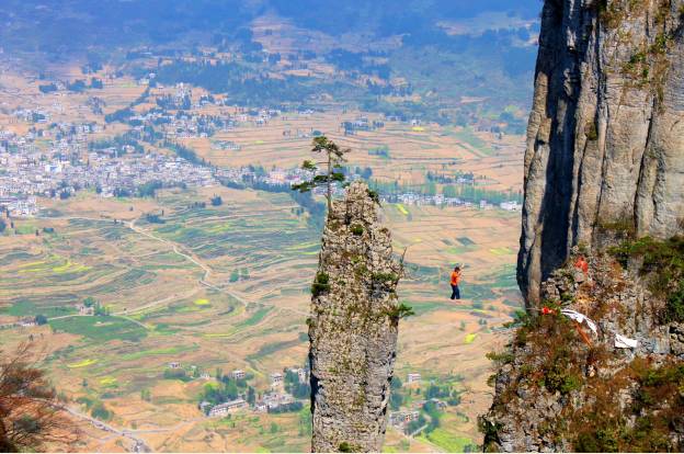 这张图片是2012年4月22日,美国铁汉迪恩·波特在没有任何保护措施的情况下行走在恩施大峡谷160米高空的一根扁带上,成功刷新了之前由他创下的走扁带世界记录。湖南电视台《芒果大直播》节目向全球直播了这次挑战极限的现场盛况,迪恩波特在临离开大峡谷之前写道:Enshi Grand Canyon The Heaven for the climbers.(恩施大峡谷攀岩者的天堂)