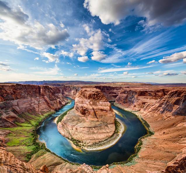 可以参加精彩的自费活动:餐后前往全世界最奇特的狭缝洞穴——世界十大摄影地点之一的【羚羊彩穴】! 其位于美国亚利桑纳州北方,是柔软的砂岩经过百万年的各种侵蚀力所形成。该彩穴的岩壁融合了千百年来风和洪流的侵蚀,呈完美的波浪形,是大自然的抽像画。一直以来彩穴都是纳瓦霍印第安人静坐沉思的净地,他们相信这里可以聆听神的声音。随后前往马蹄湾, 她被国家地理杂志评选为十大最佳摄影地点之一,1000英尺直下的悬崖下,绿色的科罗拉多河围绕着红色的马蹄状岩石,蜿蜒流淌出270度的转角,极具震撼。翻过一段小山坡,沿着布满细沙的步道前行,眼前豁然开朗,您一定会沉醉于碧水蓝天红岩钩织出的动人心魄之美。